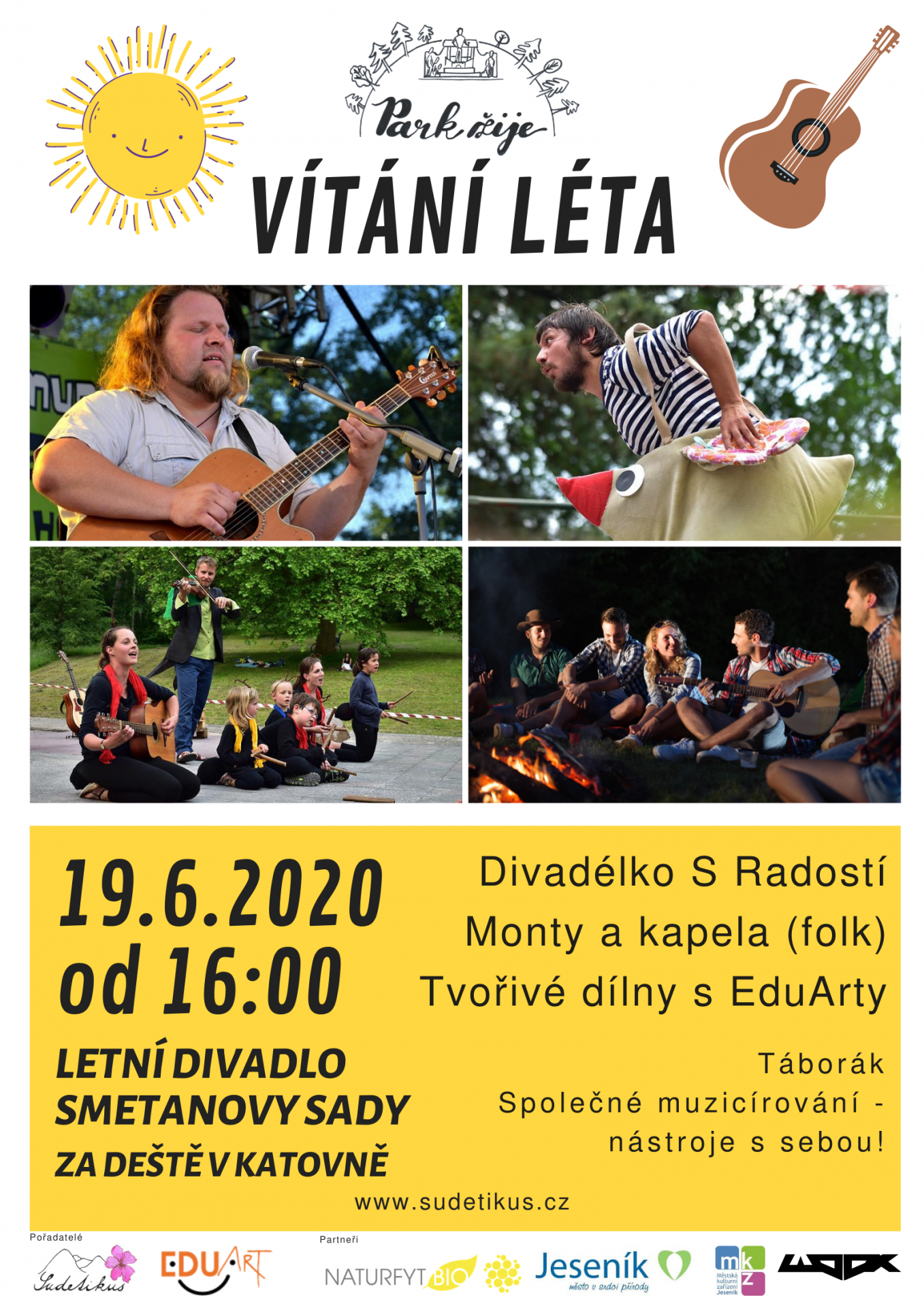 Tímto bychom chtěli všem poděkovat, v první řadě dobrovolníkům, kteří nám byli ochotni se vším pomoct, protože bez nich bychom to nezvládli! Dále samozřejmě všem účinkujícím a lektorům dílen, kteří byli i v tom deštivém počasí naším sluncem a udělali nám pátečního odpoledne nezapomenutelný zážitek. Také díky kuchařům Kasie s Karma Busem a Kubovi s Klárkou. Dále děkujeme partnerům spolku, Městu Jeseník, MKZ Jeseník a firmám Naturfyt - BIO, s.r.o. a WOOX. A nakonec vám všem, kteří jste přišli a byli s námi! VELKÉ DÍKY, a budeme se těšit na další společnou akci.