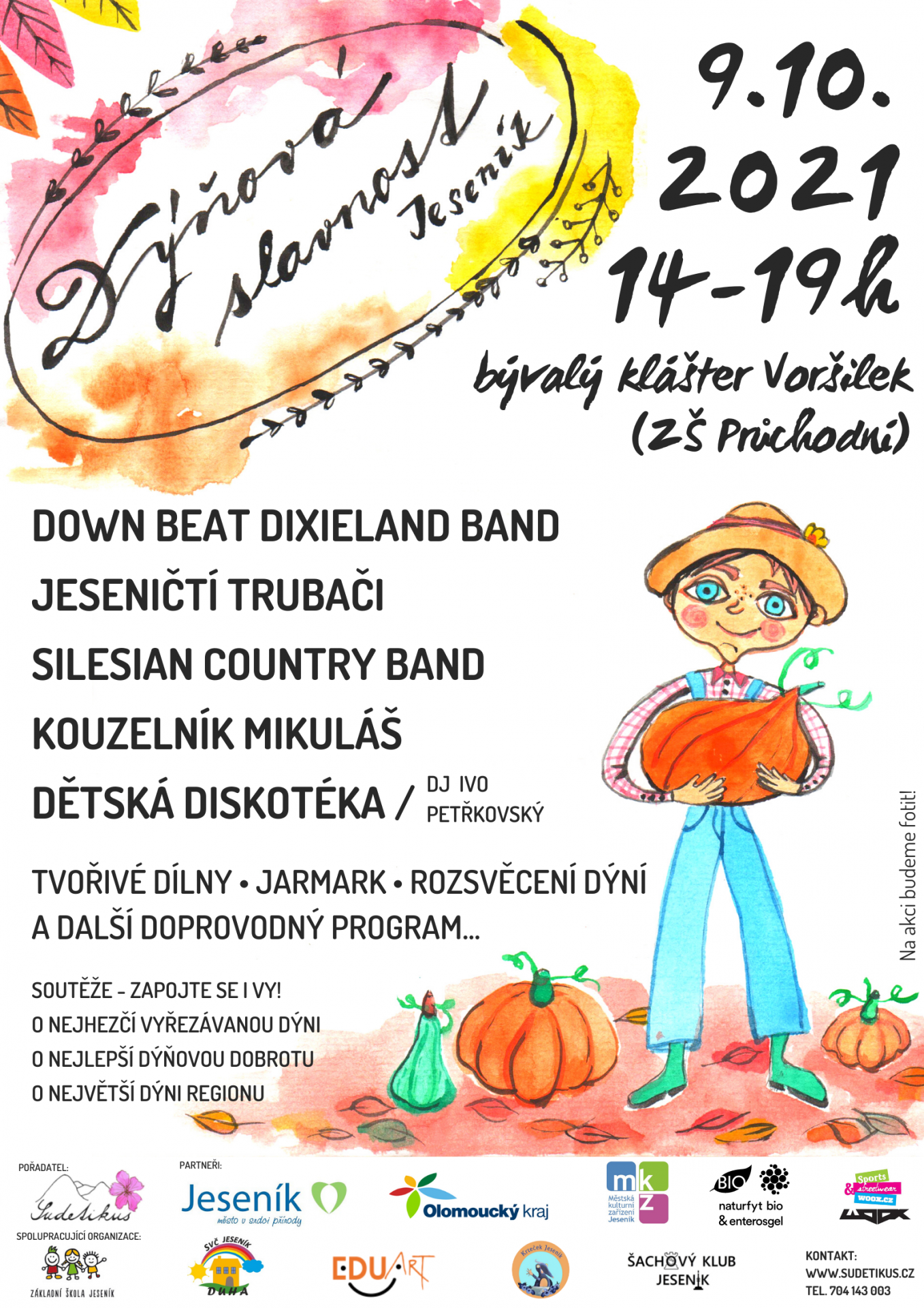 Dýňová slavnost 2021Dýňová slavnost v roce 2021 se uskuteční v sobotu 9. října v areálu bývalého kláštera sv. Voršily - nyní ZŠ Průchodní. Program: Dýňová slavnost - 9.10.2021 Moderátor: Štěpán Jati PROGRAM 1 Pódium 14:00 - Úvodní slovo 14:00 - 15:00 Down Beat Dixieland Band 15:00 - 15:15 Vyhlášení vítězů O největší dýni regionu 15:15 - 16:00 Jeseničtí trubači 16:00 - 16:15 Vyhlášení vítězů O nejlepší dobrotu 2021 16:15 - 17:00 Silesia Country Band 17:00 - 17:15 Vyhlášení vítězů o nejhezčí vyřezávanou dýni, rozsvícení lampiček 2 Kouzelnický stan 15:00 - 15:15 Kouzelník Mikuláš 16:00 - 16:15 Kouzelník Mikuláš 17:00 - 17:15 Kouzelník Mikuláš 3 Hřiště 14:00 - 17:00 Prezentace Airsoftu 17:00 - 19:00 Dětské disko s p. Petřkovským 4 Dílničkový stan u altánku EduArt MRC Krteček Lenka Šafářová Montessori? Dýňové šachy 5 Dílničkový stan u SVČ Duha Tvořivé dílny SVČ Duha Seniorský bazárek 6 Fotokoutek 7 Malování na obličej Daniela Ondruchová 8 Výstava bubáků 9 Stánky se soutěžními dobrotami 10 Výstava obřích dýní 11 Kolotoč Máte dotaz? Kontaktujte nás na tel. 704 143 003. Těšíme se na vás! Tým spolku Sudetikus |