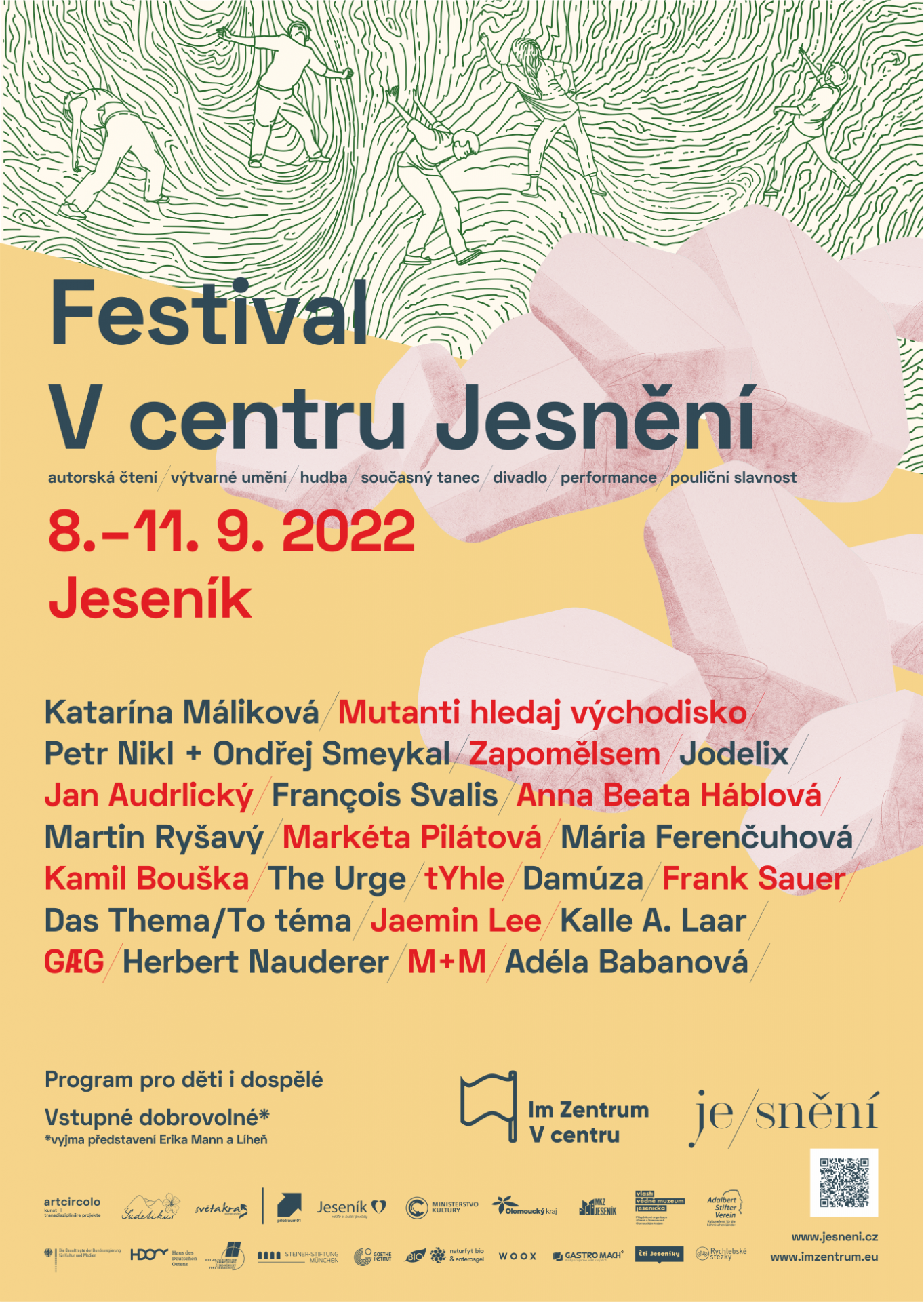 říká Lukáš, jeden z organizátorů, n ... (více) | | | Jeseník – Hudba, divadlo, literatura, film, tanec a performance. Pořadatelé dvou ryze místních festivalů Jesnění a V centru/Im Zentrum letos spojili síly a z každé události přinesou do Jeseníku ve dnech od 8. do 11. 9. 2022 to nejlepší – všechny formy umění, komunitní aktivity a prolínání nejen česko-německé kultury. Čtvrteční start bude pozvolný. V Čajbaru Pangea se představí slovenská ... (více) | | |