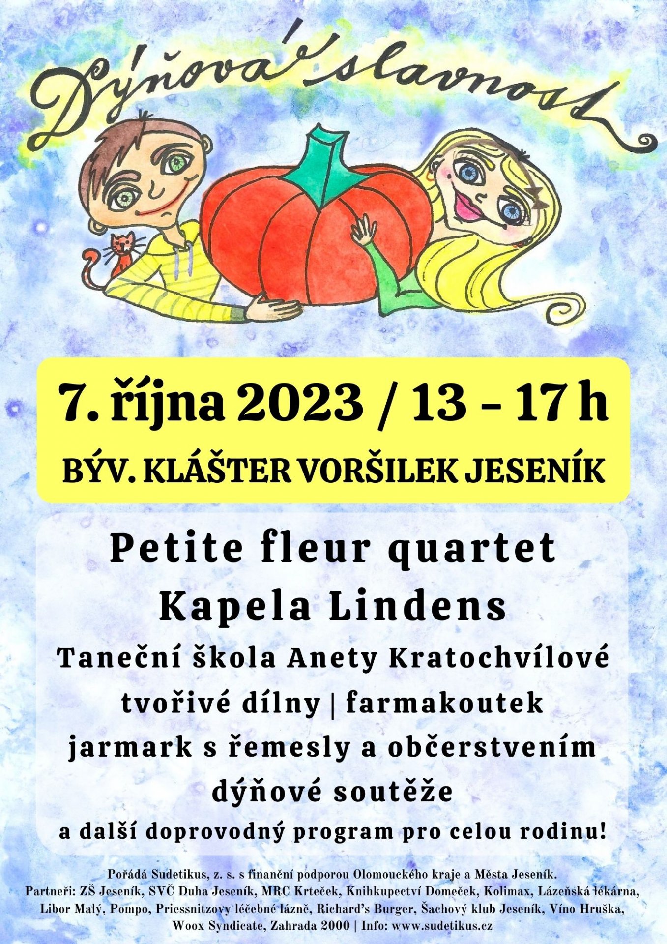Dýňová slavnost 2023Dýňová slavnost se koná letos již posedmé! V sobotu 7. října od 13ti do 17h v bývalém klášteře Voršilek (ZŠ Průchodní) uvidíte dýně všech velikostí a tvarů a nakoupíte regionální produkty! Poslechnete si koncerty místních kapel Petite Fleur Quartet a Lindens, zatančíte si s Taneční školou Anety Kratochvílové, vyrobíte si podzimní dekorace, zahrajete si dýňové šachy, pobavíte se ve farmakoutku se zvířaty, a mnoho dalšího! Pokud rádi vaříte a pečete, zapojte se se do soutěže o nejlepší dýňovou dobrotu. Všechny soutěžní dobroty bude možno ochutnat v sousedské zóně. Odkaz na přihlášení. Nebude chybět ani oblíbená soutěž o nejhezčího dýňového bubáka. Přineste svůj výrobek do 14h k registračního stánku. Pro urychlení registrace na místě, vyplňte tento formulář. Zapojte se také soutěže o největší dýni regionu – přivezte do 14:00 svého obra na registrační stánek. Program budeme postupně přibližovat v příspěvcích na facebooku a instagramu Jesenických trhů a spolku Sudetikus. Vstupné je dobrovolné - vstupenky jsou slosovatelné, v 16:30 vyhlásíme vítěze! Pořádá Sudetikus, z. s. s finanční podporou Olomouckého kraje a Města Jeseník. Partneři: ZŠ Jeseník, SVČ Duha Jeseník, MRC Krteček, Knihkupectví Domeček, Kolimax, Lázeňská lékárna, Libor Malý, Pompo, Priessnitzovy léčebné lázně, Richard’s Burger, Šachový klub Jeseník, Víno Hruška, Woox Syndicate, Zahrada 2000. Kontakt: jesenicketrhy@sudetikus.cz, tel. 704 143 003 #dynovaslavnostjesenik #jesenicketrhy |