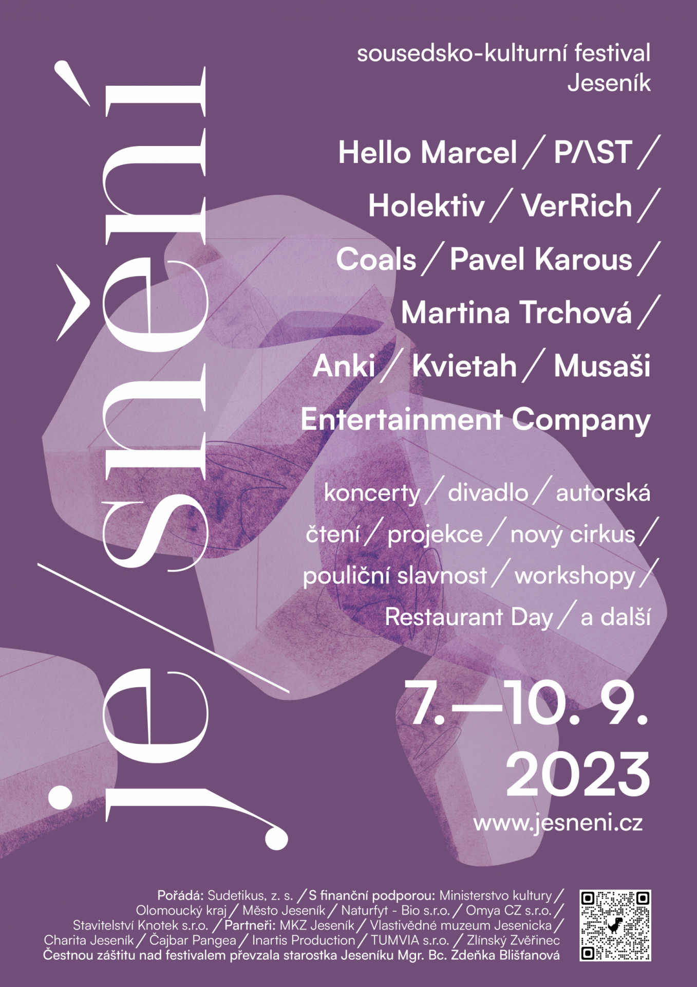 Jesnění 2023Sousedsko-kulturní festival Jesnění v Jeseníku 7 – 10. záříTřetí ročník festivalu Jesnění znamená 4 dny nabité kulturou i komunitním duchem v Jeseníku. Ožijí jesenická náměstí, parky, kavárny i historické objekty. Součástí budou koncerty, divadlo, tanec, projekce, besedy, tvořivé dílny, autorská čtení, pouliční slavnost, Restaurant Day a mnoho dalšího! Jesnění přichází s tím nejlepším, co na současné české kulturní scéně i lokální jesenické scéně vzniklo. Představí se například elektropopové duo Hello Marcel nebo experimentální rapové duo P/ST, v pouličním představení „Letkyně“ ve zažijeme atmosféru prvních aeroplánů s divadelním souborem Holektiv, a socialistickým uměním ve veřejných prostorech Jeseníku nás provede český sochař a výtvarník Pavel Karous, autor pořadu Volavky a predátoři. Jesenická kapela Chvilka volna zahraje jazz, blues a latinskoamerické rytmy, které u nás proslavila v 80. letech Eva Olmerová. Součástí bude také projekce fotografií z Jesenicka před 120 lety v 3D, které převedli studenti Slezské univerzity ve spolupráci s Vlastivědným muzeem Jesenicka. Ve spolupráci s MKZ Jeseník se bude konat tvořivá dílna „Mezi pamětí a historií“ k výstavě Marie Krajplové „Dotkni se Javorníku“ v Galerii katovna nebo vernisáž výstavy Adély Suchánkové „Skuliny“ v divadle Petra Bezruče. Program a další informace najdete na www.jesneni.cz Vstupenky: https://goout.net/cs/jesneni-2023/szotbaw/ |