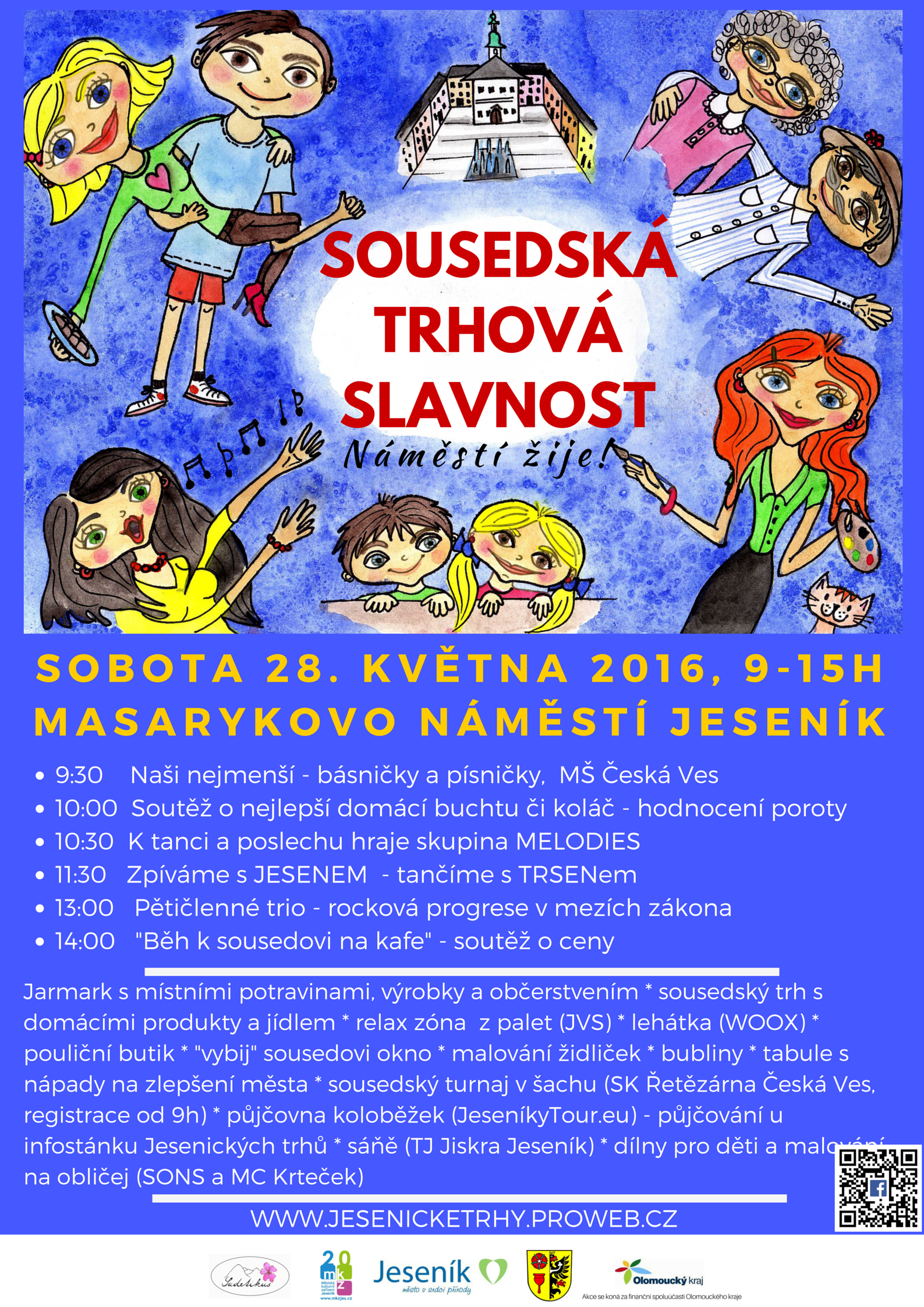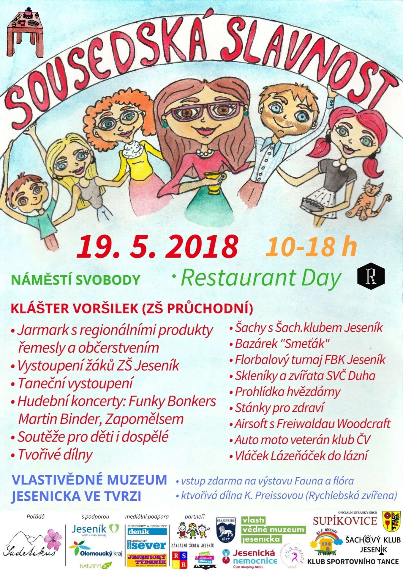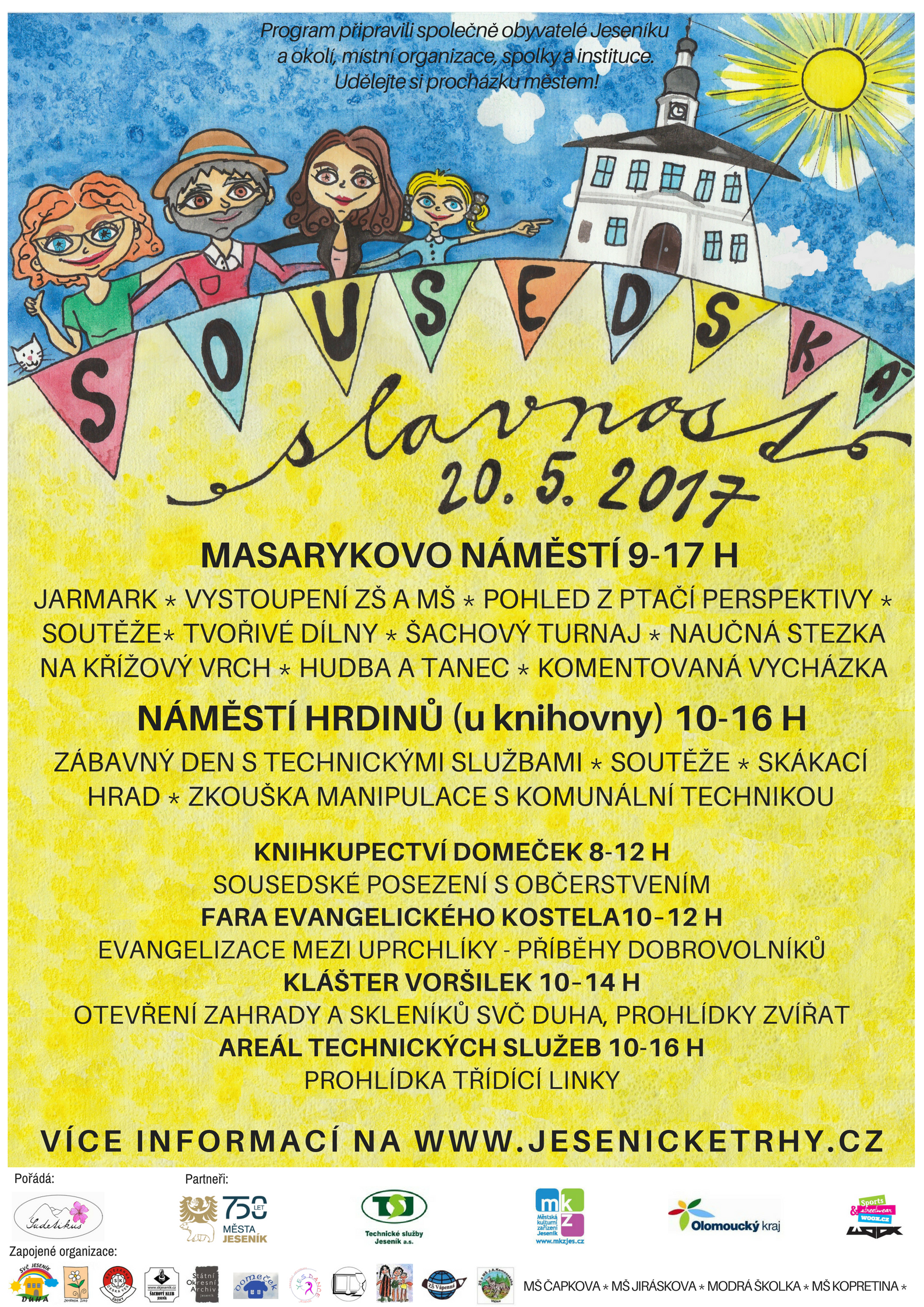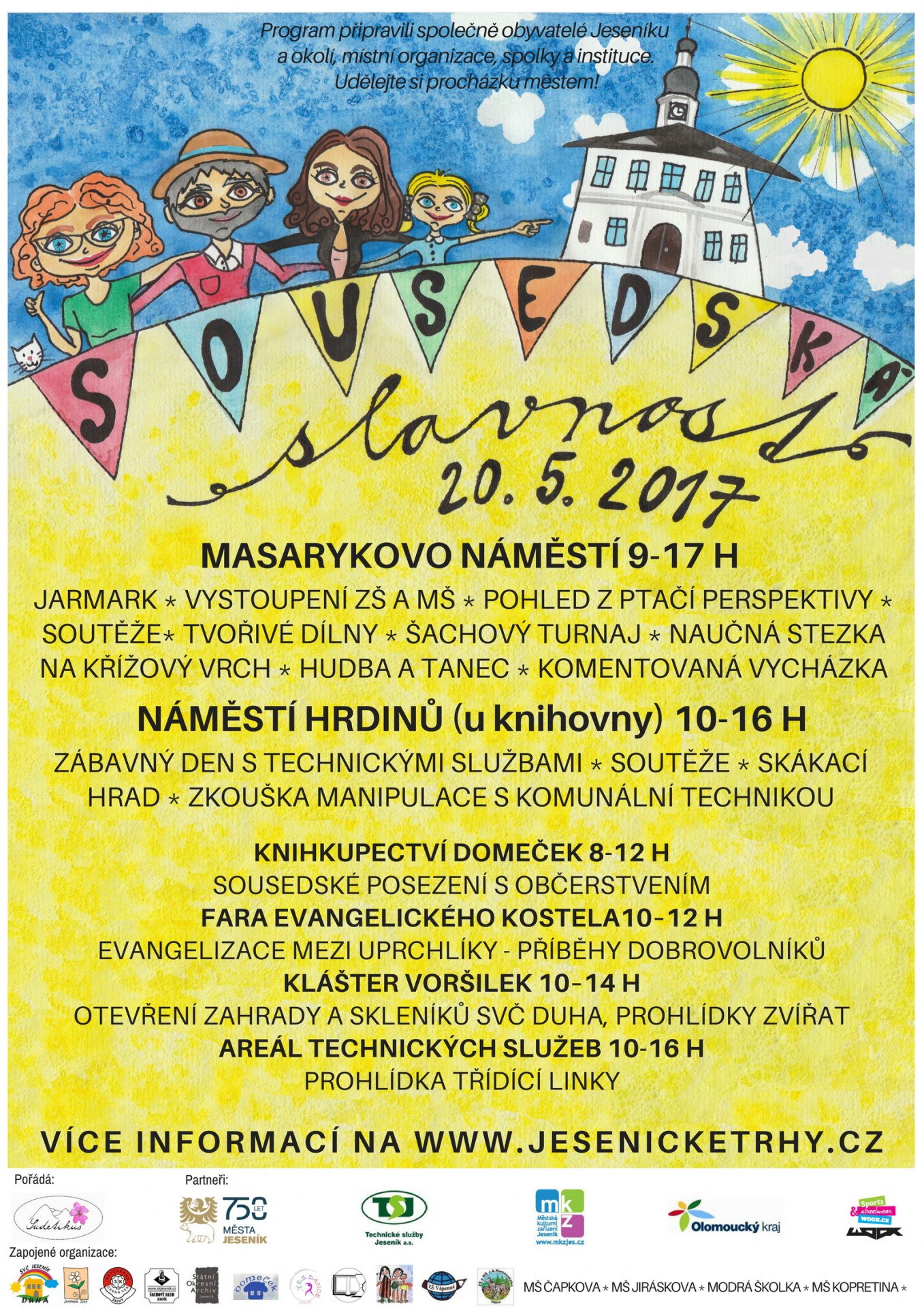 Sousedská slavnostSousedská slavnost má za cíl oživit město, zapojit různé skupiny obyvatel do aktivit, propojit lidi navzájem, posílit mezilidské vztahy a dát jim možnost strávit čas společně jako sousedé v jednom městě. Sousedskou slavnost jsme pořádali v letech 2016, 2017 a 2018. Konala se na mnoha místech v celém Jeseníku a zapojily se do ní desítky místních pořadatelů, spolků i jednotlivců. Nástupcem sousedské slavnosti jsou akce cyklu Park žije!, které měly za cíl společně oživit letní divadlo ve Smetanových sadech a další místa v parku včetně náplavky. Více informací najdete na našem facebooku. | ||||||||||||